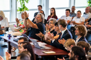 Gaandeweg het project worden de studenten en de teams steeds meer zelfsturend en kan er vaak volstaan worden met korte overleggen met de teamcaptains. Mooie ontwikkelingen!’