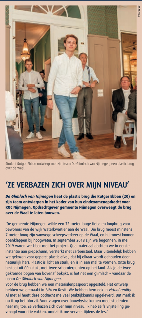 De glimlach van Nijmegen is het circulaire brugontwerp van het studententeam uit Nijmegen. Het is een fiets/loopbrug met een hoge mate van circulariteit. Maar de ‘chromosoom’ mag er ook zijn. De gemeente moet nog een keuze maken waarmee ze de Waalhaven met de Romeinse binnenstad wil verbinden.